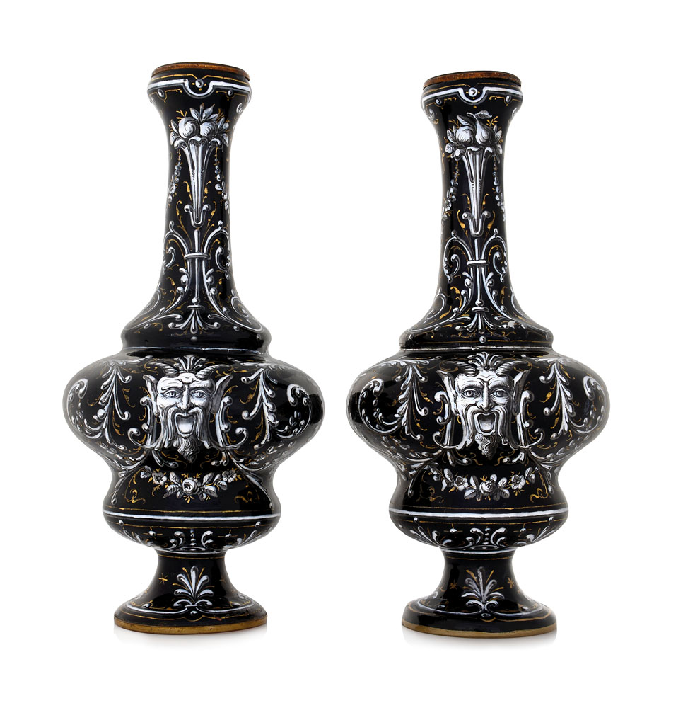 COPPIA DI VASI IN METALLO DECORATO A SMALTI, LIMOGES, XIX SECOLO, interamente decorati a grottesche, mascheroni e girali fitomorfe su fondo nero.