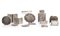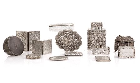 SEI PORTA CIPRIA, DUE TABACCHIERE, UN PORTA TE', UN COFANETTO, UN CARNET DA BALLO, UNO SPECCHIO IN ARGENTO E UNA SCATOLINA IN CRISTALLO E ARGENTO, XIX-XX SECOLO, di diversa forma e decoro, alcuni pezzi con specchio interno; usure.