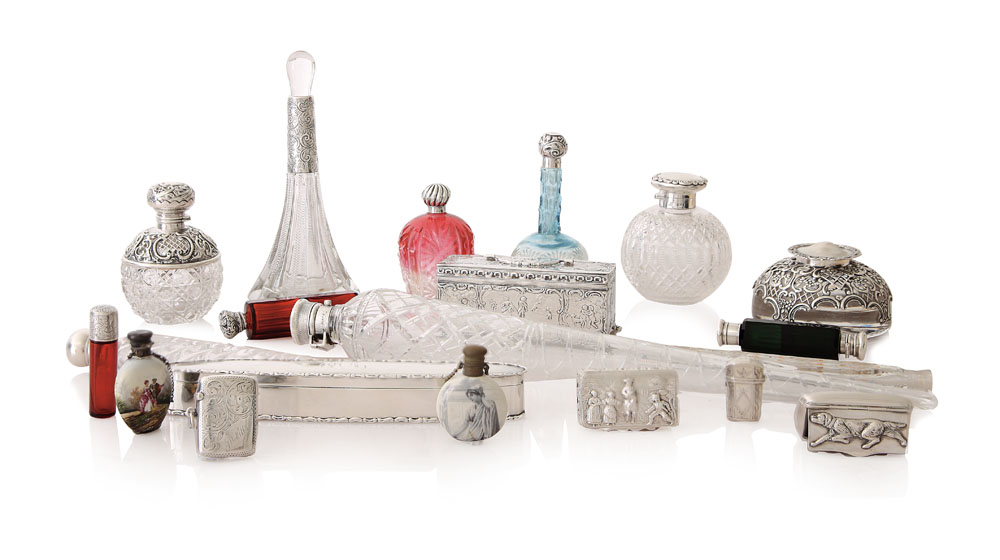 LOTTO DI QUATTORDICI PORTAPROFUMO E SEI SCATOLE IN CRISTALLO E ARGENTO, XIX-XX SECOLO, di diversa forma e decoro, perlopiù di fattura inglese; qualche piccola mancanza.