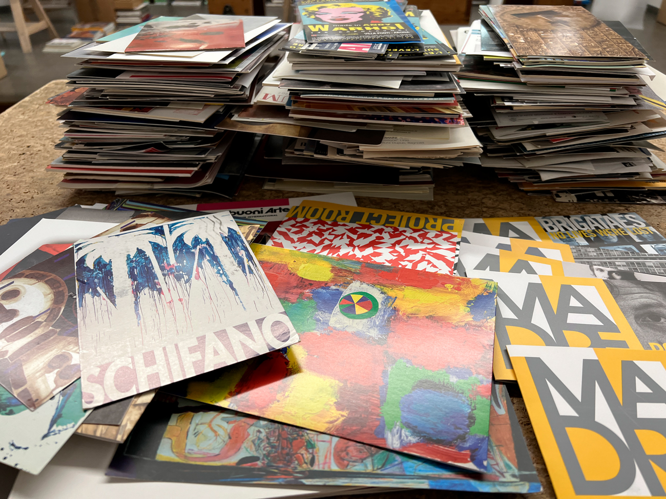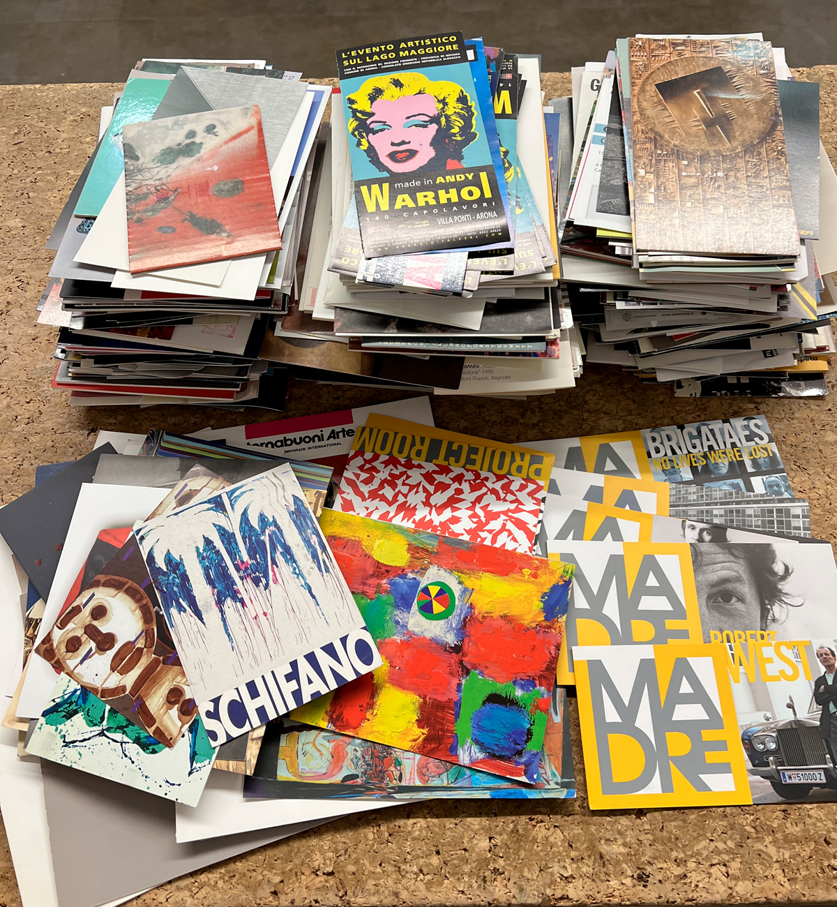 Scatola contenente diverse decine di inviti, depliant e piccoli pighevoli illustrati editi in occasione di esposizioni personali e collettive dei principali artisti del dopoguerra, editi da gallerie italiane e internazionali, istituzioni e musei