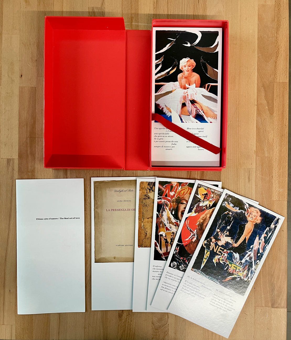 All'interno è presente un fascicolo di presentazione e 12 riproduzioni sciolte su cartone rigido (11 riferite a opere di Mimmo Rotella e una riferita ad una cartella di Alda Merini)