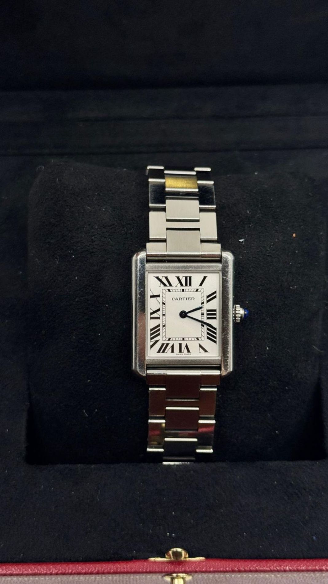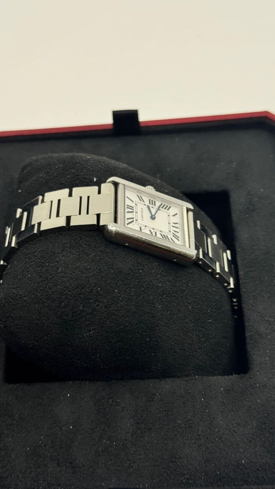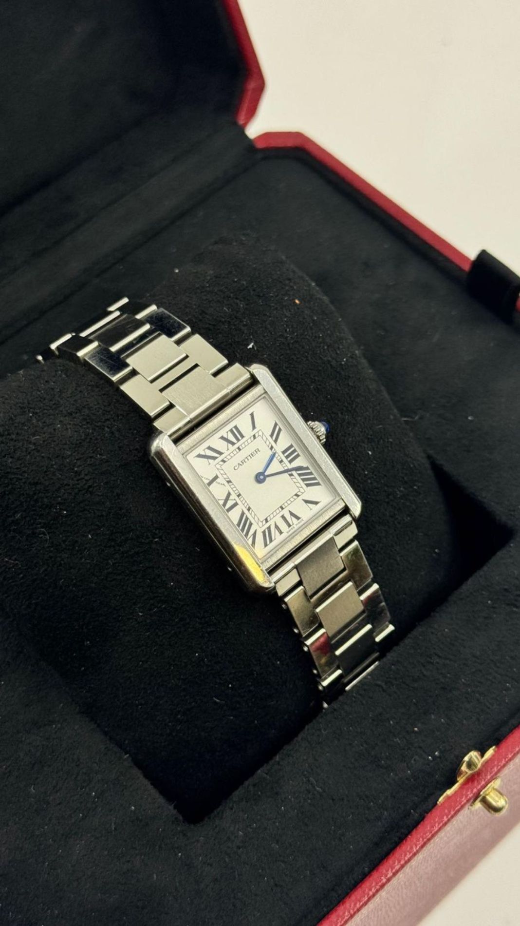 Marca Cartier Modello (Orologio) Tank Solo Numero di referenza 3170 Carica Quarzo Materiale della cassa Acciaio Materiale cinturino Acciaio Anno di produzione 2018 Documenti originali e scatola Carica Quarzo Cassa Materiale della cassa Acciaio Diametro 24 x 31 mm Impermeabile 3 ATM Materiale lunetta Acciaio Vetro Vetro zaffiro Numeri sul quadrante Romani Cinturino Materiale cinturino Acciaio Colore cinturino Acciaio Chiusura Déployante Materiale chiusura Acciaio