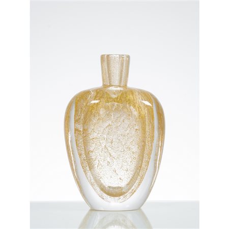 Vaso in vetro incolore con inclusioni oro, corpo ovalizzato con basso collo lievemente strombato, bocca piana circolare.