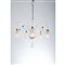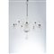 Lampada a sospensione a cinque luci in vetro bullicante incolore, diffusori a campana costolata, cinque bracci curvati in basso con diffusori e cinque bracci a torchon con sfere decorative, minuterie in ottone.