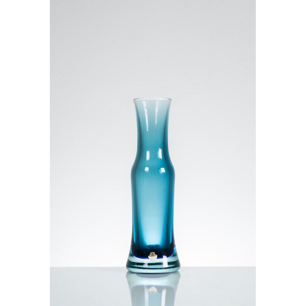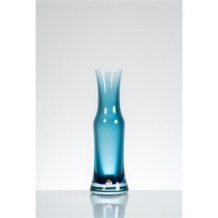 Vaso modello “13855” in vetro sommerso blu azzurrino con corpo cilindrico sagomato, bocca circolare piana e collo sagomato. Etichetta di produzione.