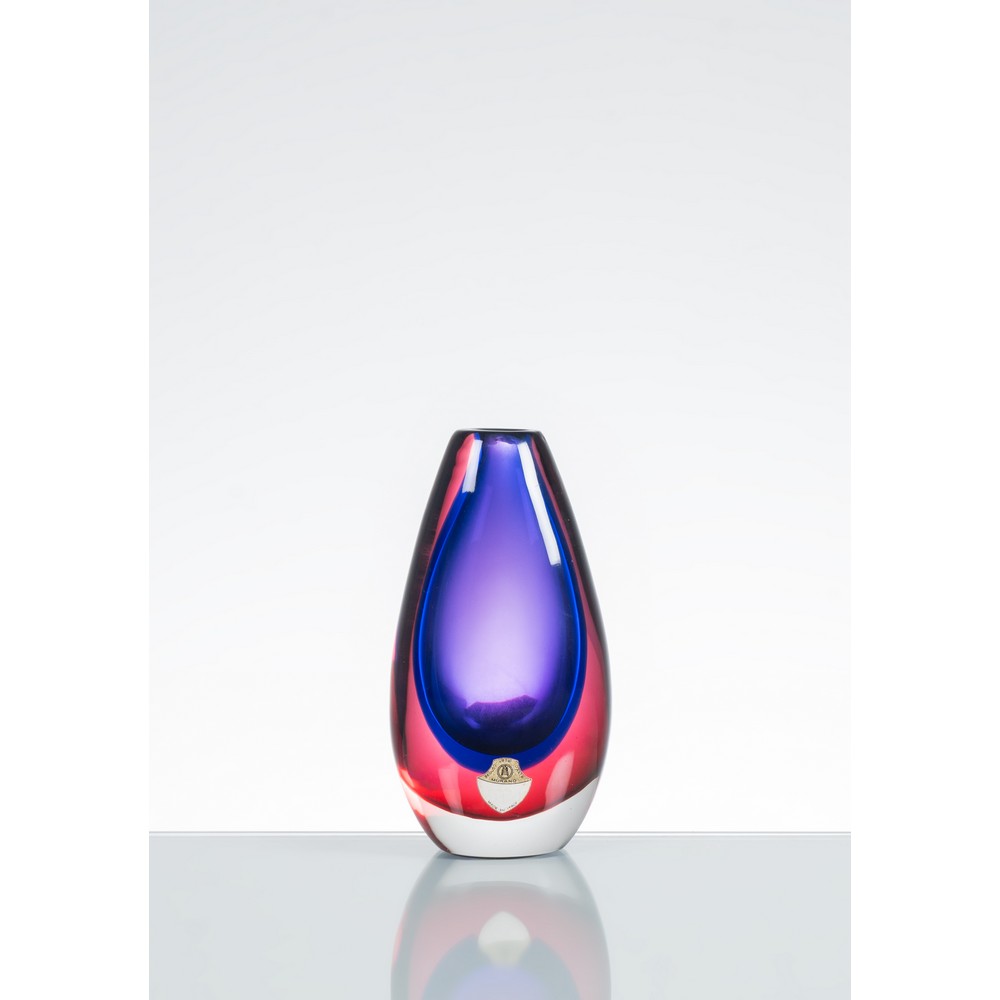 Vaso modello “11621” in vetro sommerso blu, rubino e incolore, corpo a goccia, bocca circolare piana.