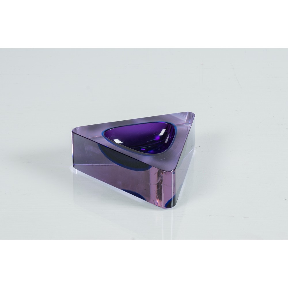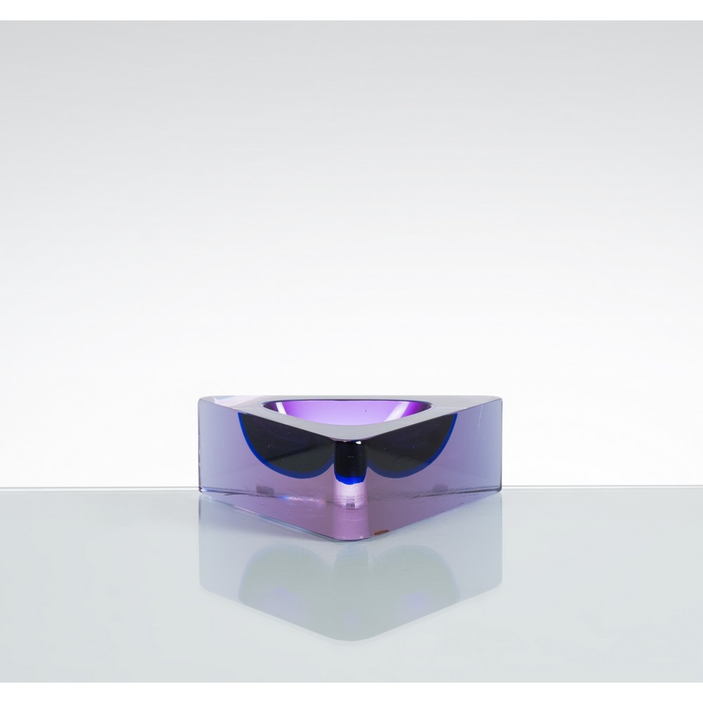 Posacenere in vetro sommerso violetto e blu, corpo triangolare con angoli arrotondati.