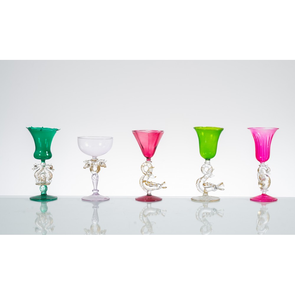 Collezione di cinque bicchieri in vetro soffiato con coppa di forma e colore differente, gambo con animali fantastici in vetro incolore con inclusioni oro.