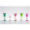 Collezione di cinque bicchieri in vetro soffiato con coppa di forma e colore differente, gambo con animali fantastici in vetro incolore con inclusioni oro.