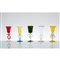 Collezione di cinque bicchieri in vetro soffiato con coppa di forma e colore differente, gambo con volute e anse in vetro incolore con inclusioni oro e in vetro colorato.