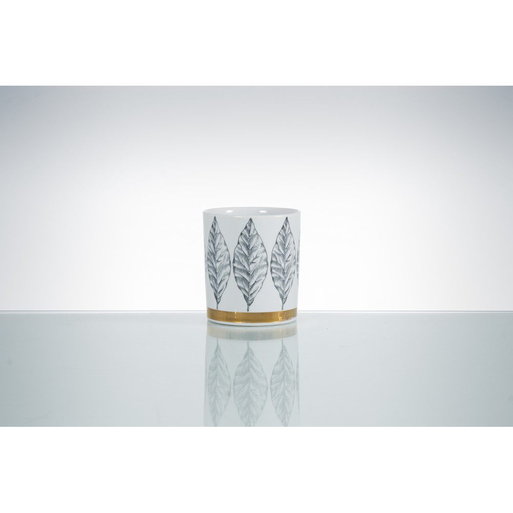 Un bicchiere portamatite in porcellana decorata con motivi di foglie in nero e bordo oro, marchio di produzione "Fornasetti Milano Made in Italy. Creazione per Ti. vi. emme.