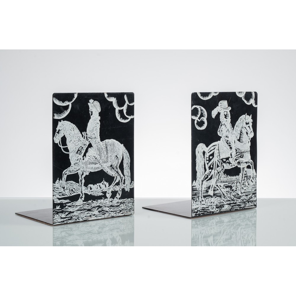 Coppia di reggilibri in metallo nero con serigrafia bianca di figure di cavalieri a cavallo. Marchio di produzione.