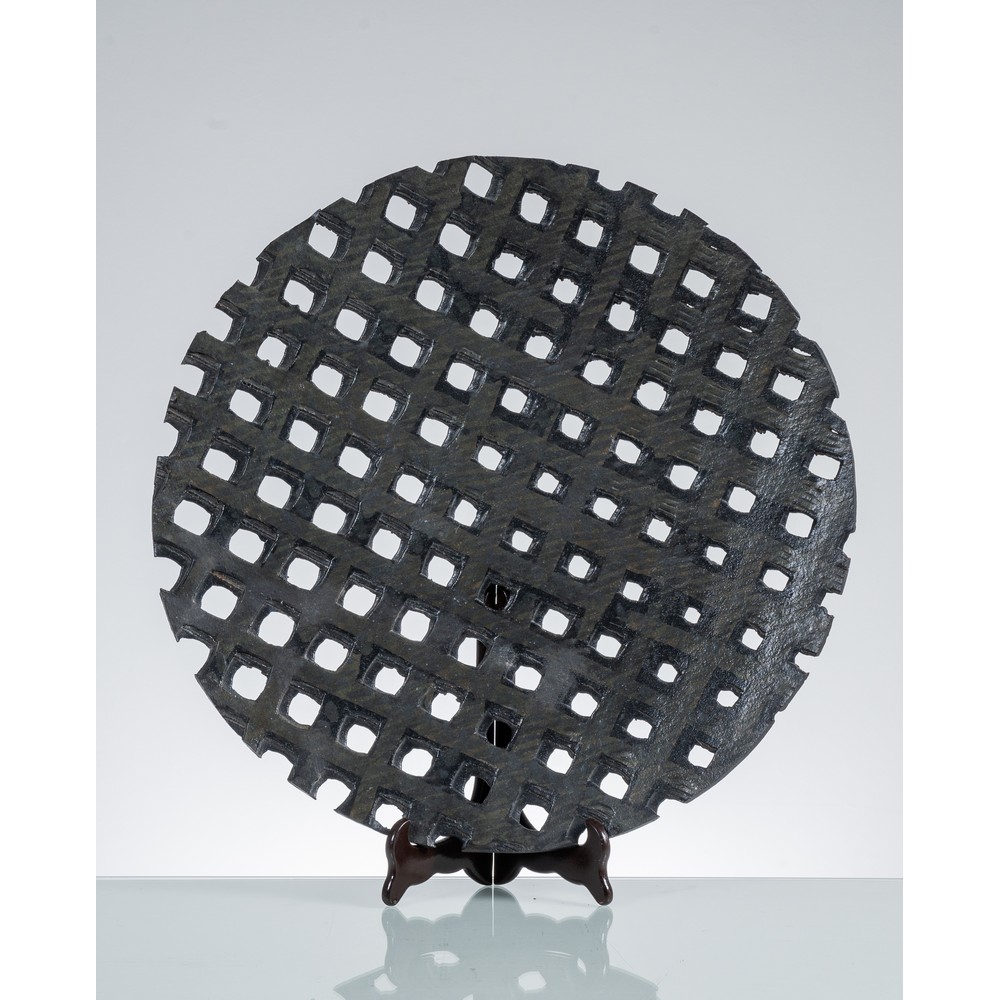 Centrotavola in terraglia, colaggio a intreccio con decoro di smalto nero.