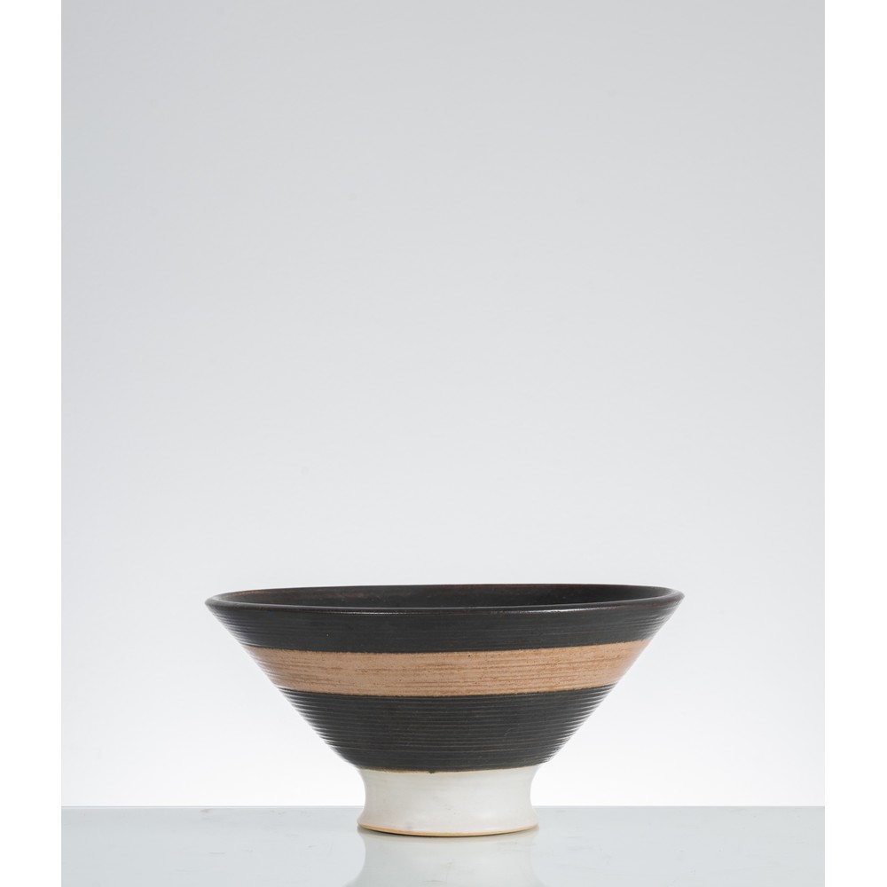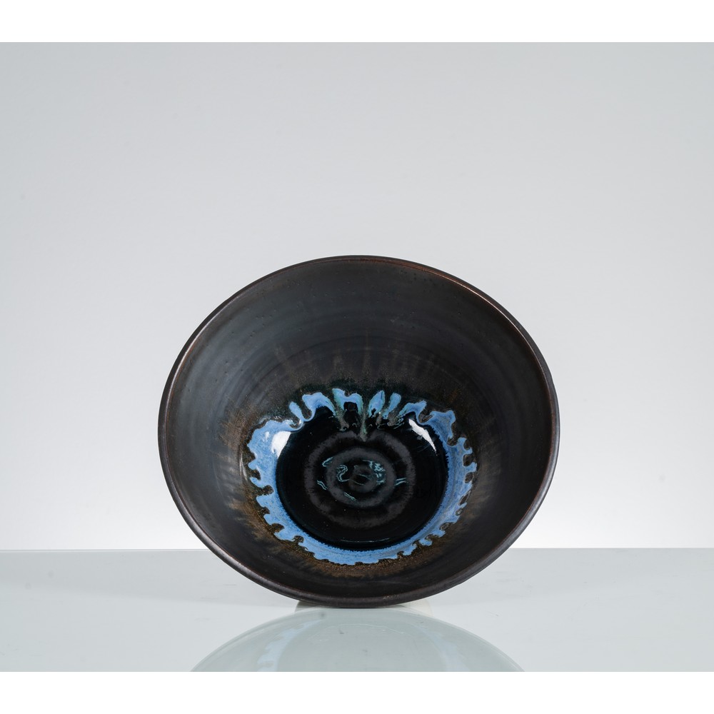 Coppa in ceramica smaltata nera, bianca e beige, corpo a vaso, decoro interno astratto in smalto blu. Firma sotto la base.