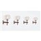 Quattro lampade da parete ad una luce con struttura in metallo cromato e legno, diffusore sferico in vetro trasparente.