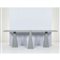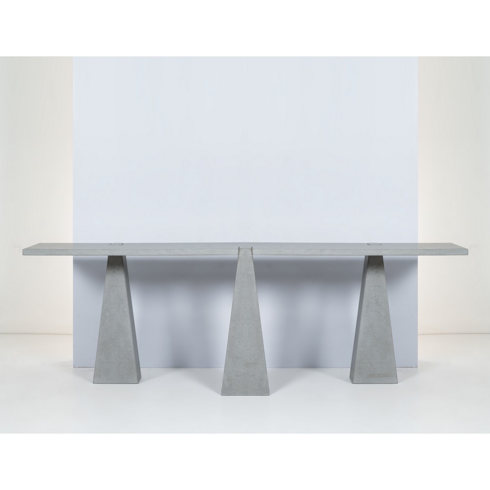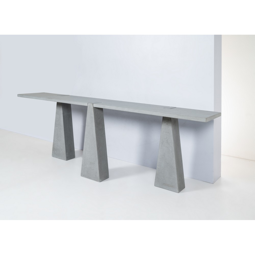 Consolle della serie “Incas” in pietra serena, tre piedi troncopiramidali, piano rettangolare con incastri.