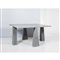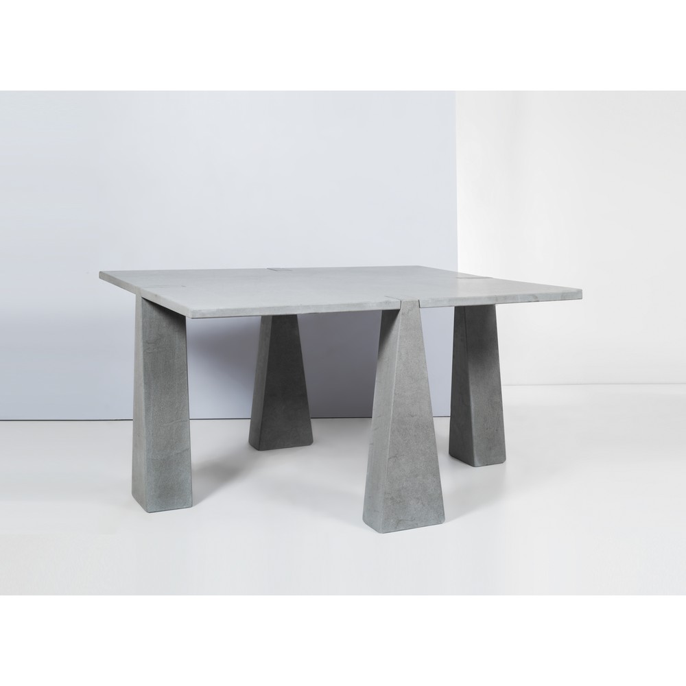 Tavolo da pranzo della serie “Incas” in pietra serena, quattro piedi troncopiramidali, piano quadrato con incastri.