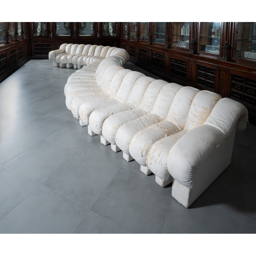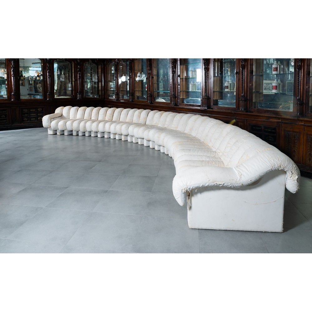 Divano modulare modello “DS 600” composto da trentadue moduli semimobili costituiti da un nucleo in schiuma rigida a forma di "L" ricoperto da un cuscino imbottito e rivestito in pelle bianca. Elementi collegati con una cerniera plug-in e una struttura in pelle e cerniera. Segni di uso e rivestimento originale da rifare. Tutte le componenti sono originali.