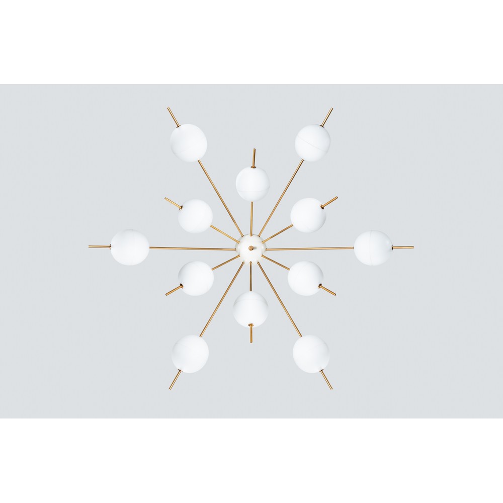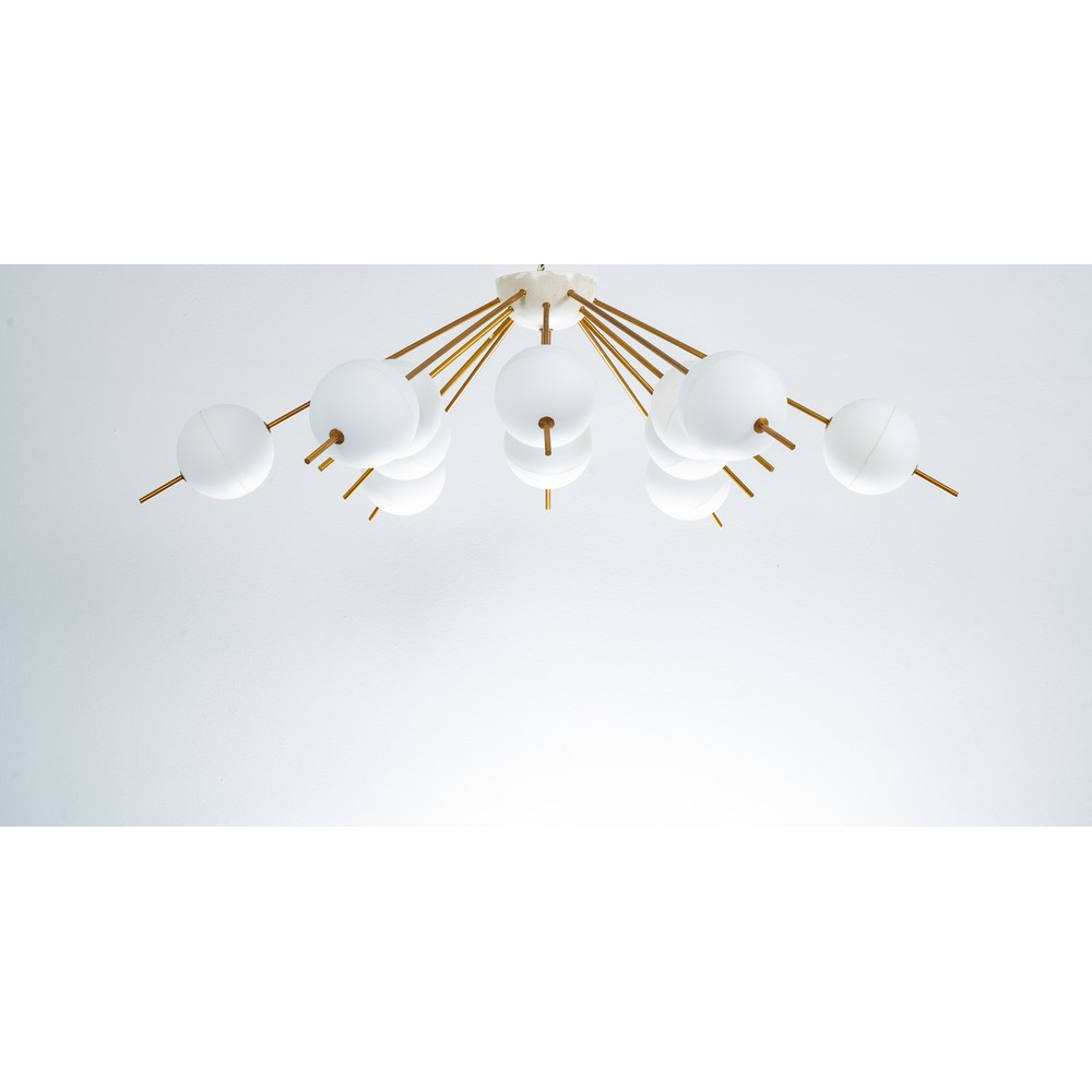 Lampada a sospensione a dodici luci, struttura in ottone, metallo laccato bianco, diffusori sferici in vetro opale lattimo.
