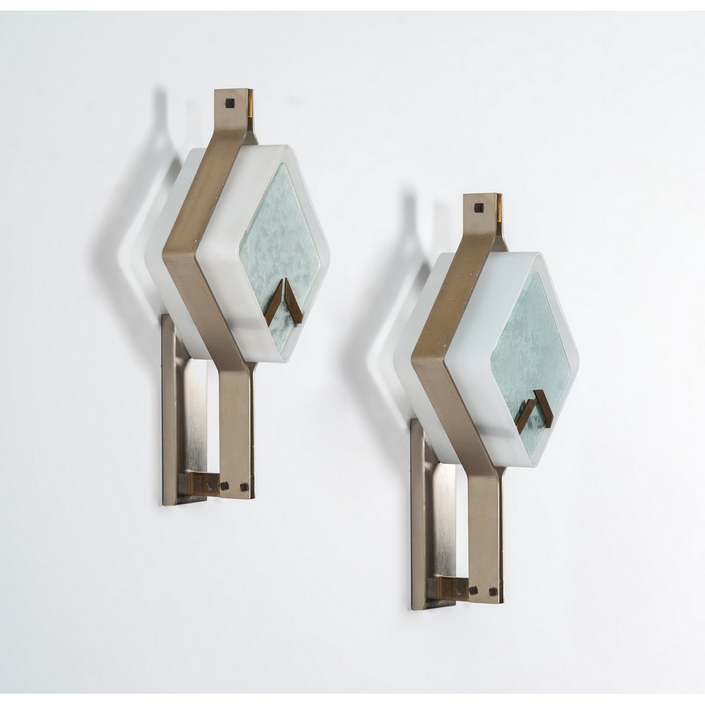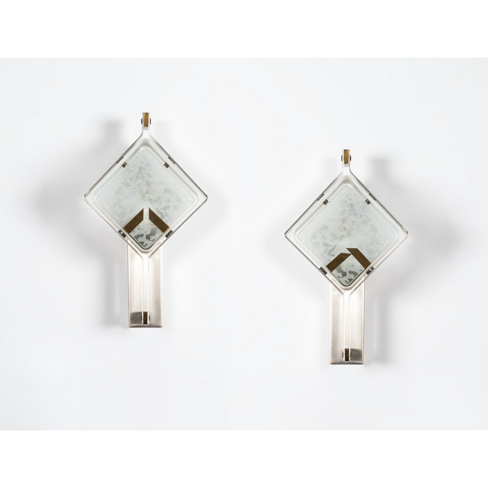 Coppia di lampade da parete ad una luce con struttura in acciaio spazzolato, ottone, diffusore quadrato in vetro opalino satinato e cristallo incolore a scalpello. Minuterie in ottone.