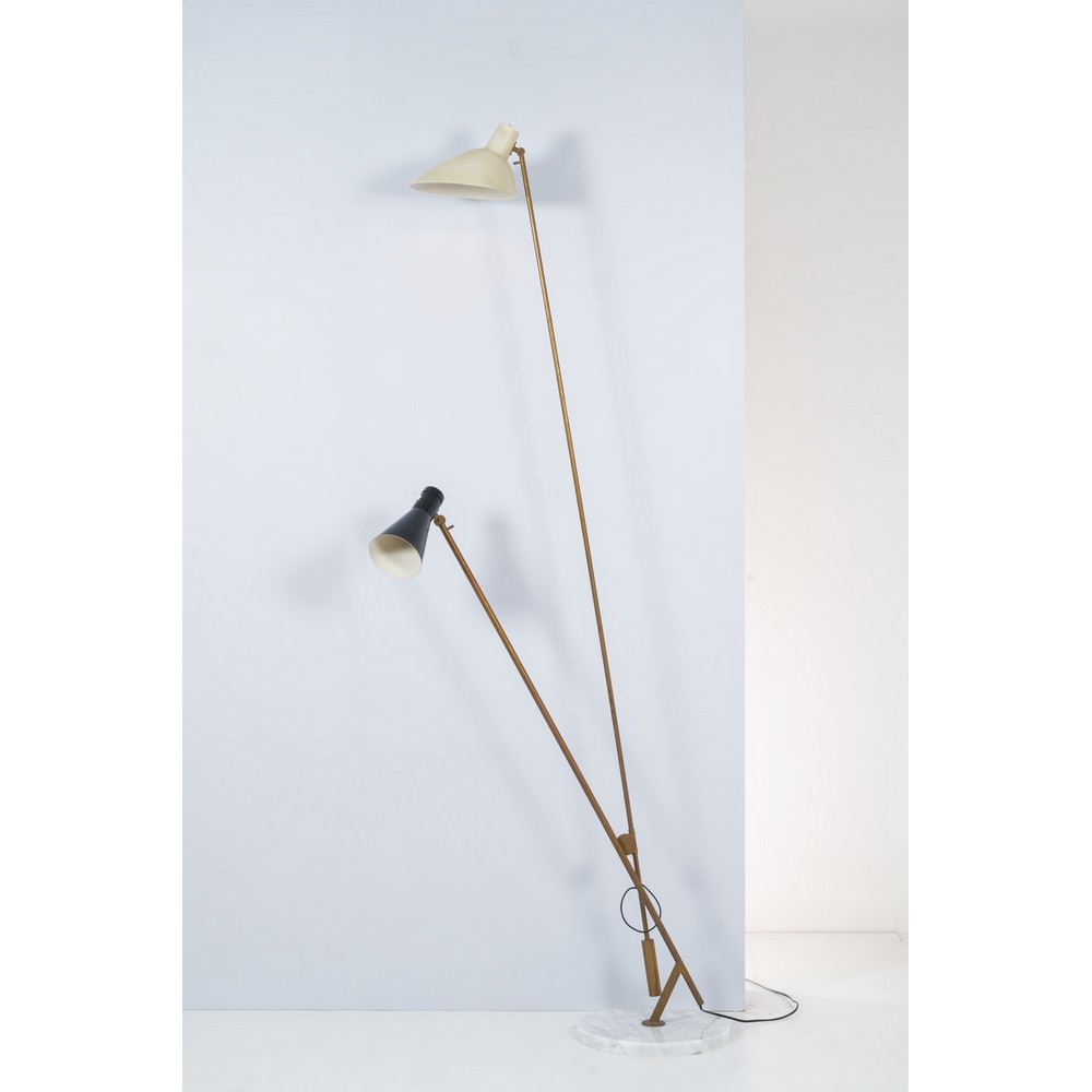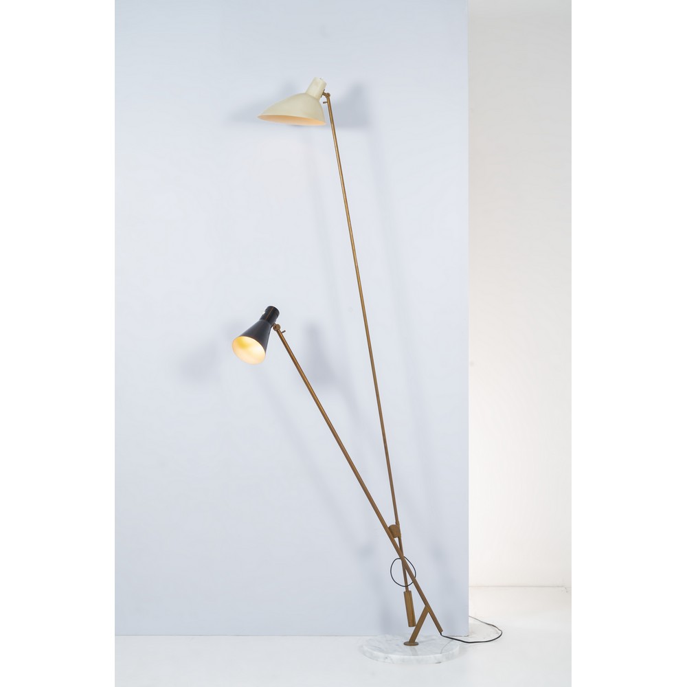 Lampada da terra a due luci modello “1049”, bracci in ottone con diffusori orientabili in alluminio laccato bianco e nero, base circolare in marmo. Etichetta di produzione.