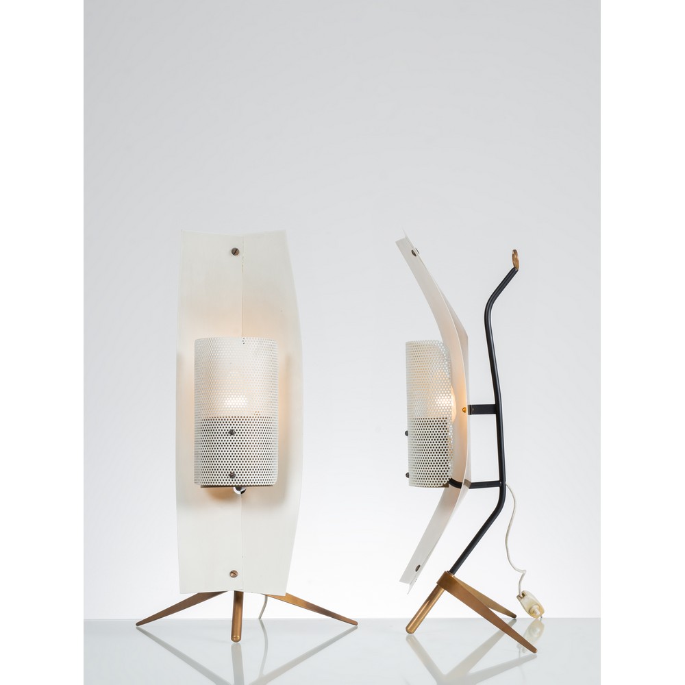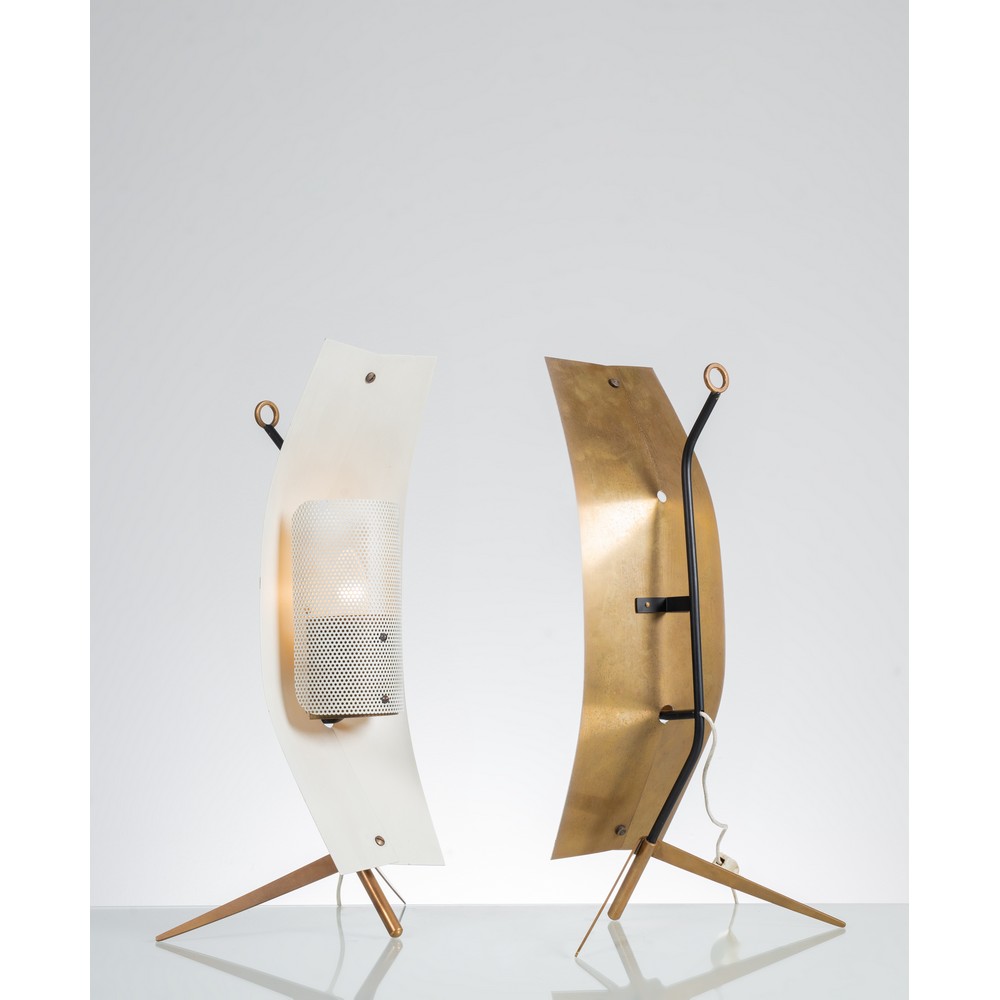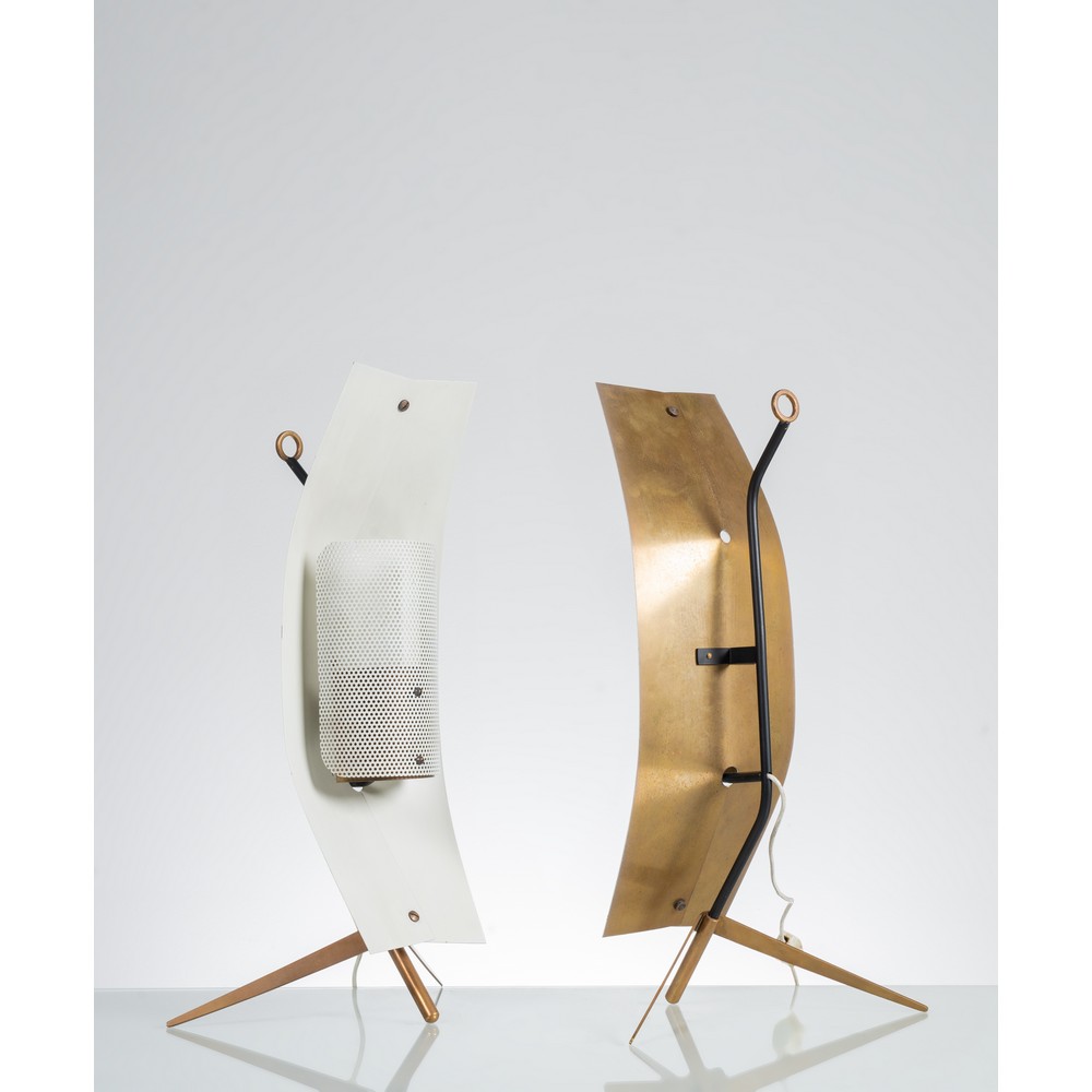 Coppia di lampade da parete e da tavolo ad una luce, struttura in tondino metallico smaltato nero, compensato curvato laccato bianco, diffusore in rete metallica smaltata bianca, ottone.