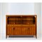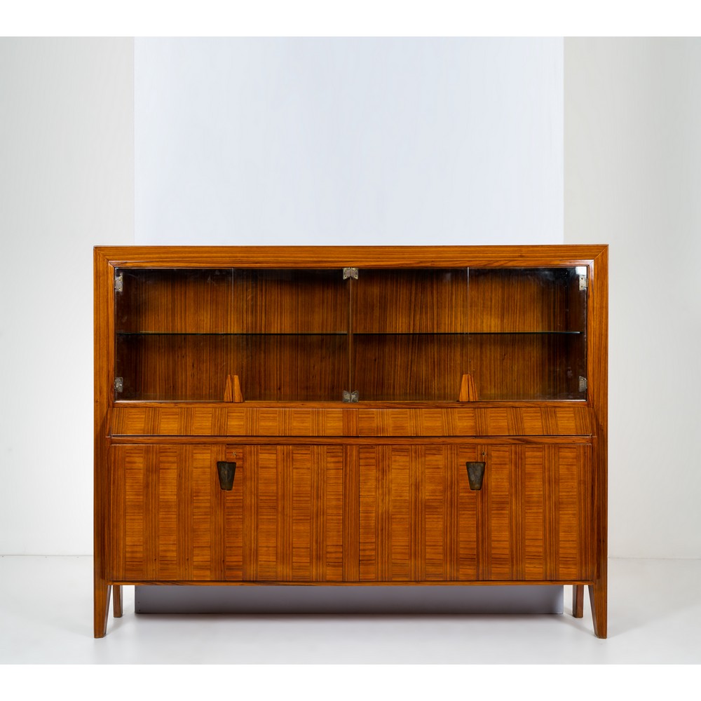 Mobile con vetrina in legno esotico, sul fronte in basso due vani con ripiano, chiusi con coppia di ante a battente, marqueterie geometriche e maniglia in ottone, quattro cassetti; sul piano superiore due vani con piano in vetro e coppia di ante in vetro incolore con maniglia in legno. Minuterie in ottone.