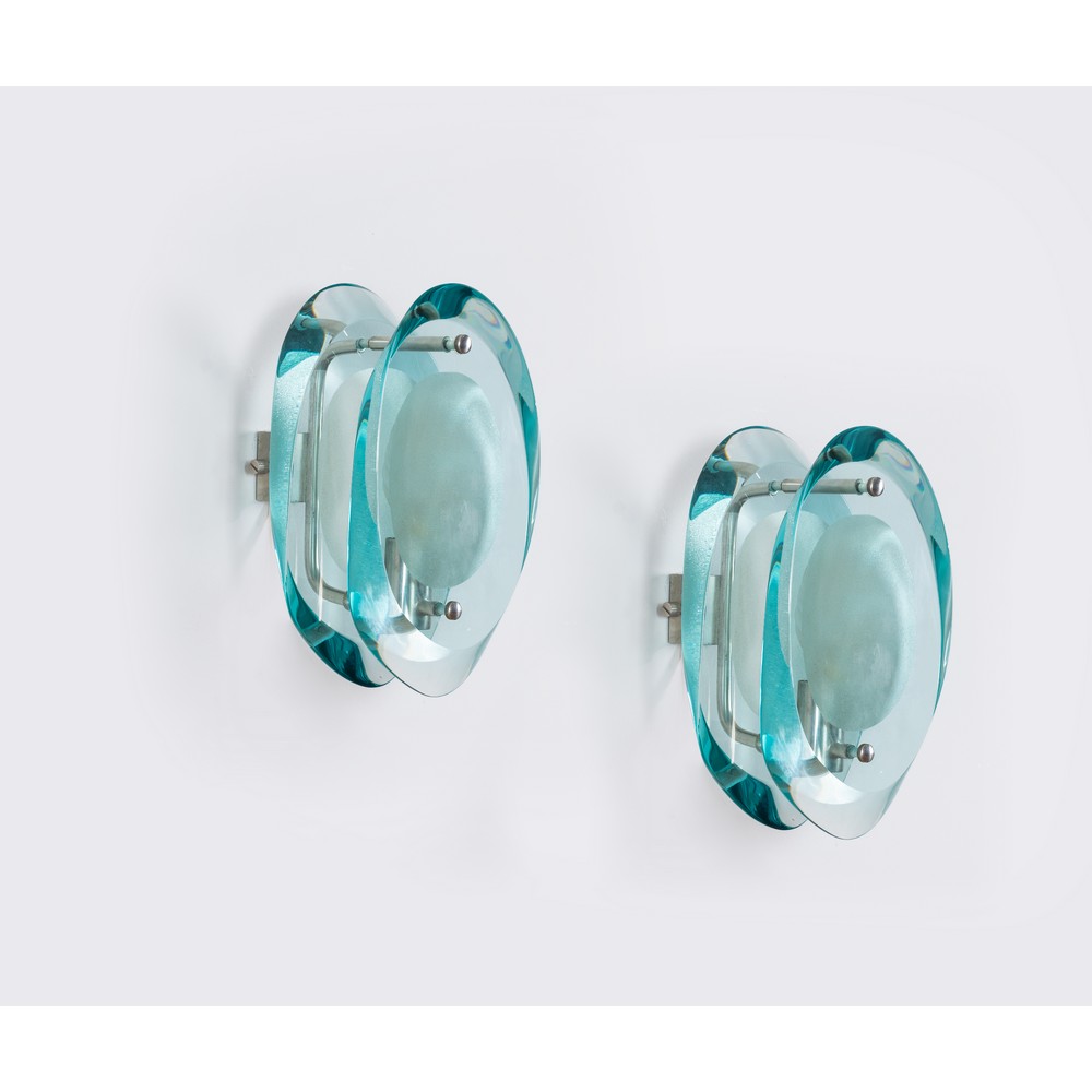 Coppia di lampade da parete ad una luce modello “2093”, diffusore a doppia lente in cristallo sagomato, molatone satinato internamente. Struttura in ottone verniciato.