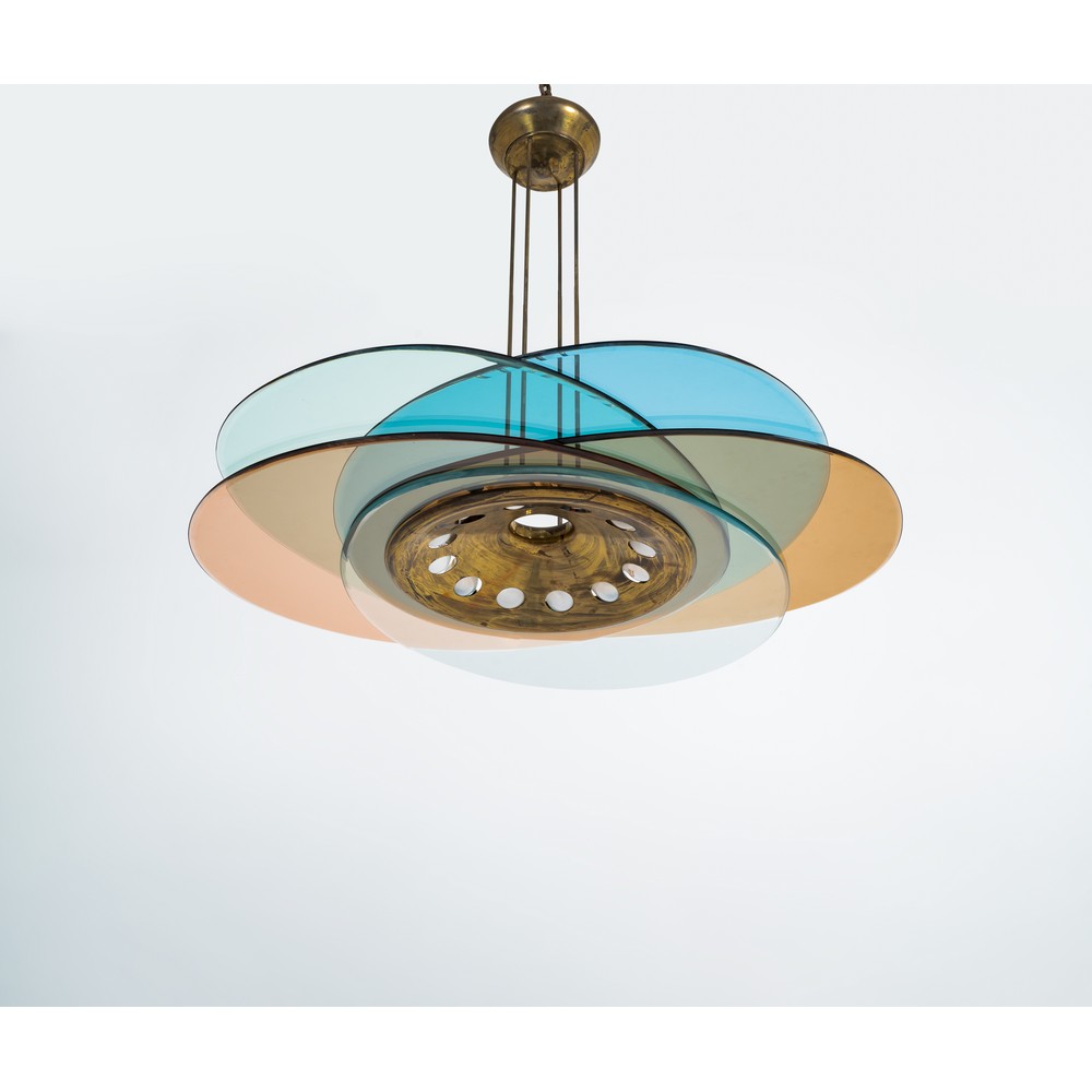 Lampada a sospensione a dodici luci modello “1452”, struttura in ottone, diffusore composto da lastre ovalizzate in cristallo molato di differente colore.
