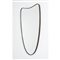 Specchio da parete con corpo a scudo, curvato nell’ estremità superiore, cristallo specchiato ed ottone lucido.