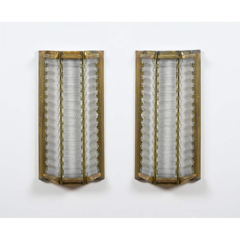 Coppia di lampade da parete a tre luci con struttura in ottone, diffusore trilaterale con tre vetri incolore stampati e ondulati. Un vetro laterale incollato.
