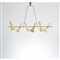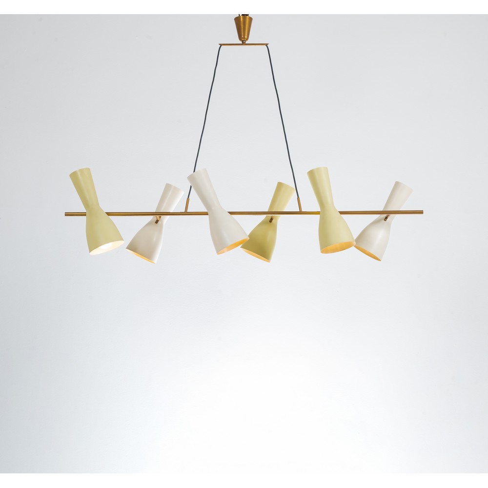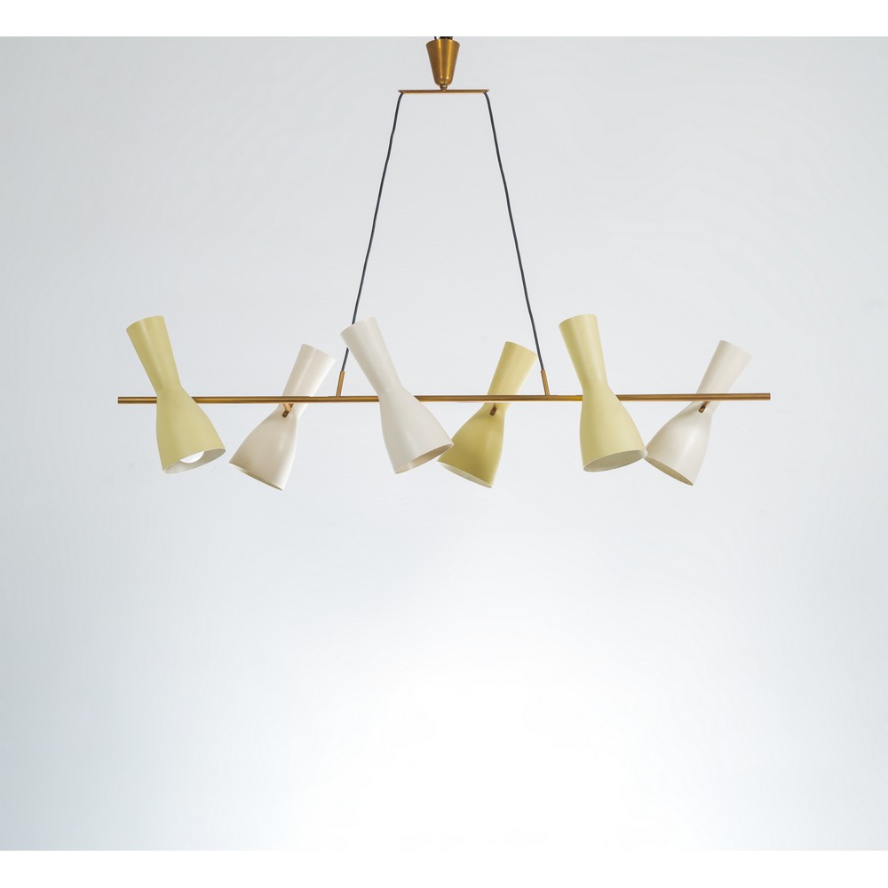 Lampada a sospensione a dodici luci, struttura in ottone, sei diffusori luminosi orientabili a cono in metallo verniciato giallo e bianco.
