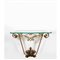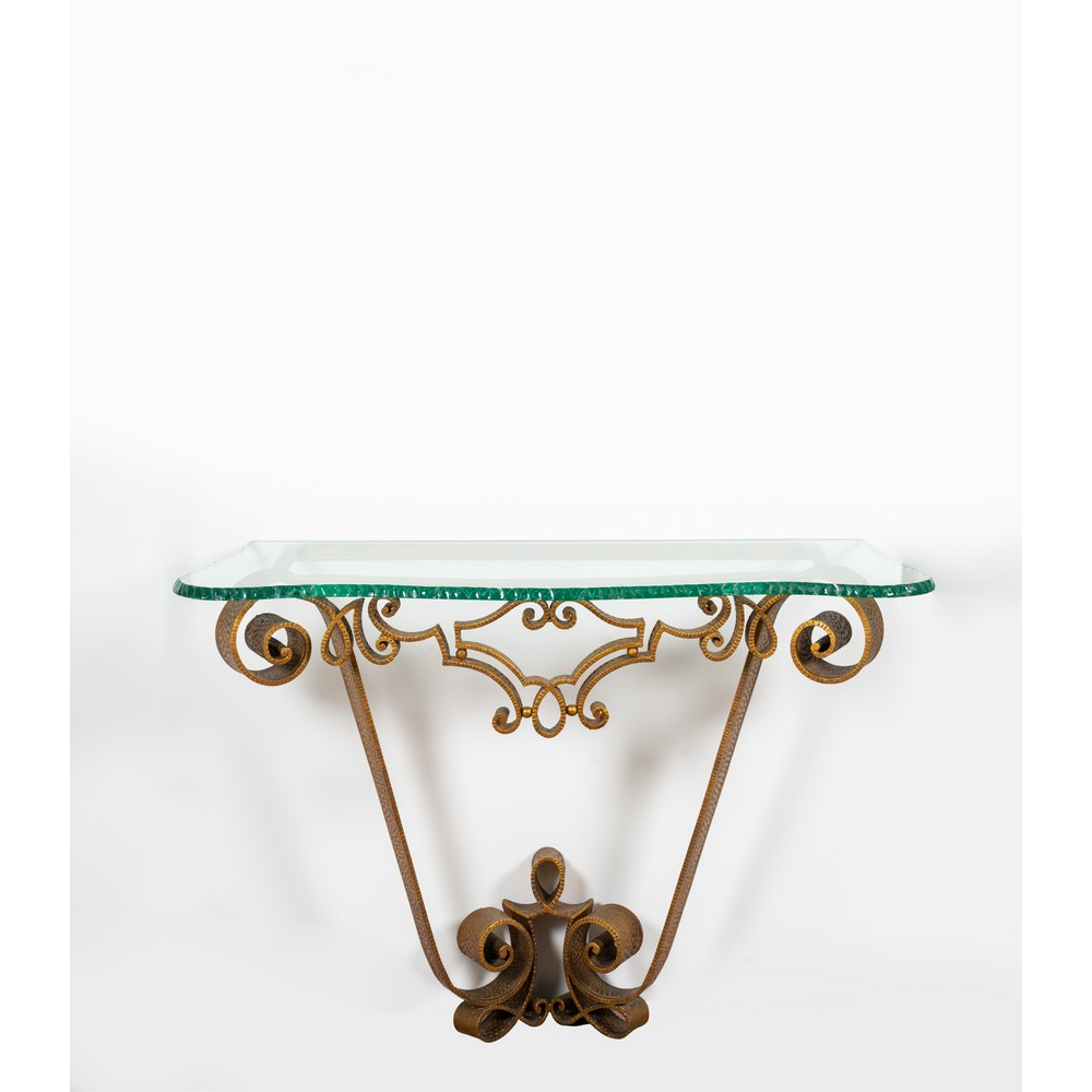 Consolle in ferro battuto dorato con piano sagomato in cristallo molato di grosso spessore con bordi a spacco vivo.
