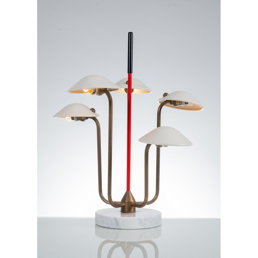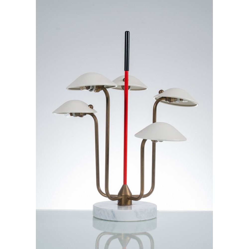 Lampada da tavolo a cinque luci modello “534/4” "funghetto", struttura in ottone con diffusori in metallo verniciato bianco, base circolare in marmo di Carrara, stelo centrale verniciato rosso con maniglia nera. Marchio di produzione.