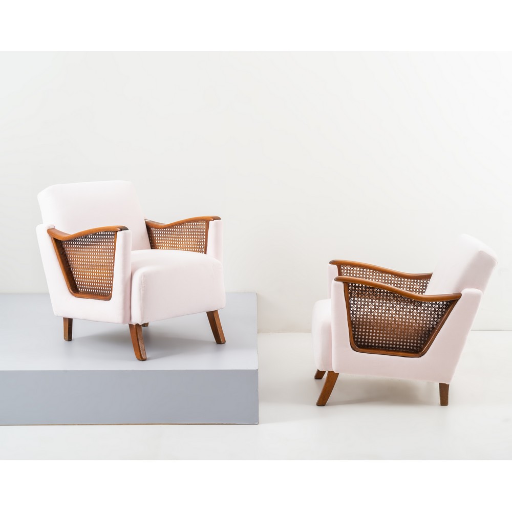 Coppia di poltrone con struttura in legno, fianchi in legno curvato e midollino, imbottitura e rivestimento con tessuto rosa pallido, piedi in legno. Restaurate.