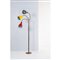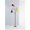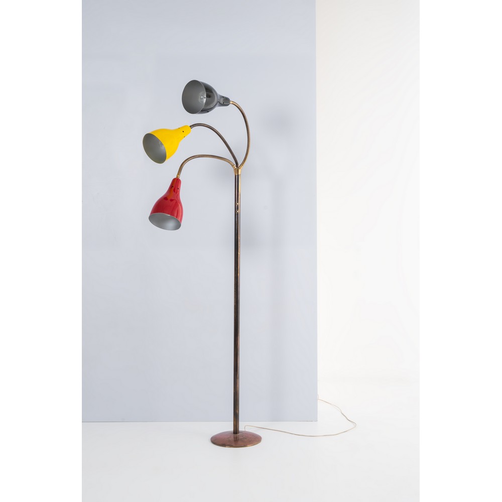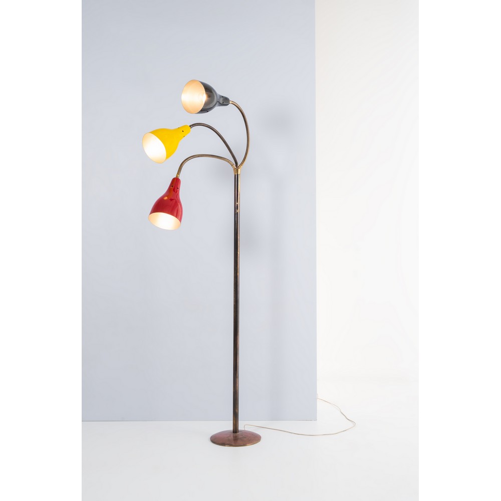 Lampada da terra a tre luci, struttura in ottone con tre bracci orientabili in ottone a molla, diffusori a campana in metallo verniciato uno nero/bianco, uno giallo/bianco ed uno rosso/bianco. Base circolare in ottone.
