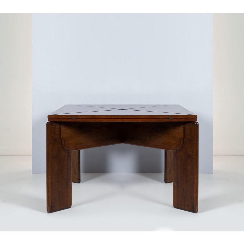 Tavolo da pranzo allungabile in legno di noce, piano quadrato con quattro spicchi a ribalta per aumentare la dimensione del piano. Segni di uso e piccolo difetto.