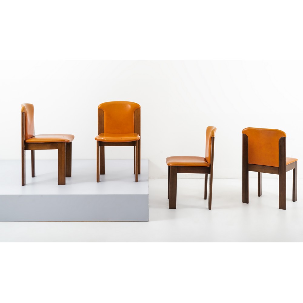 Quattro sedie modello “330” in legno di noce, seduta e schienale con imbottitura e rivestimento in pelle cognac. Segni di uso e usure alla pelle.