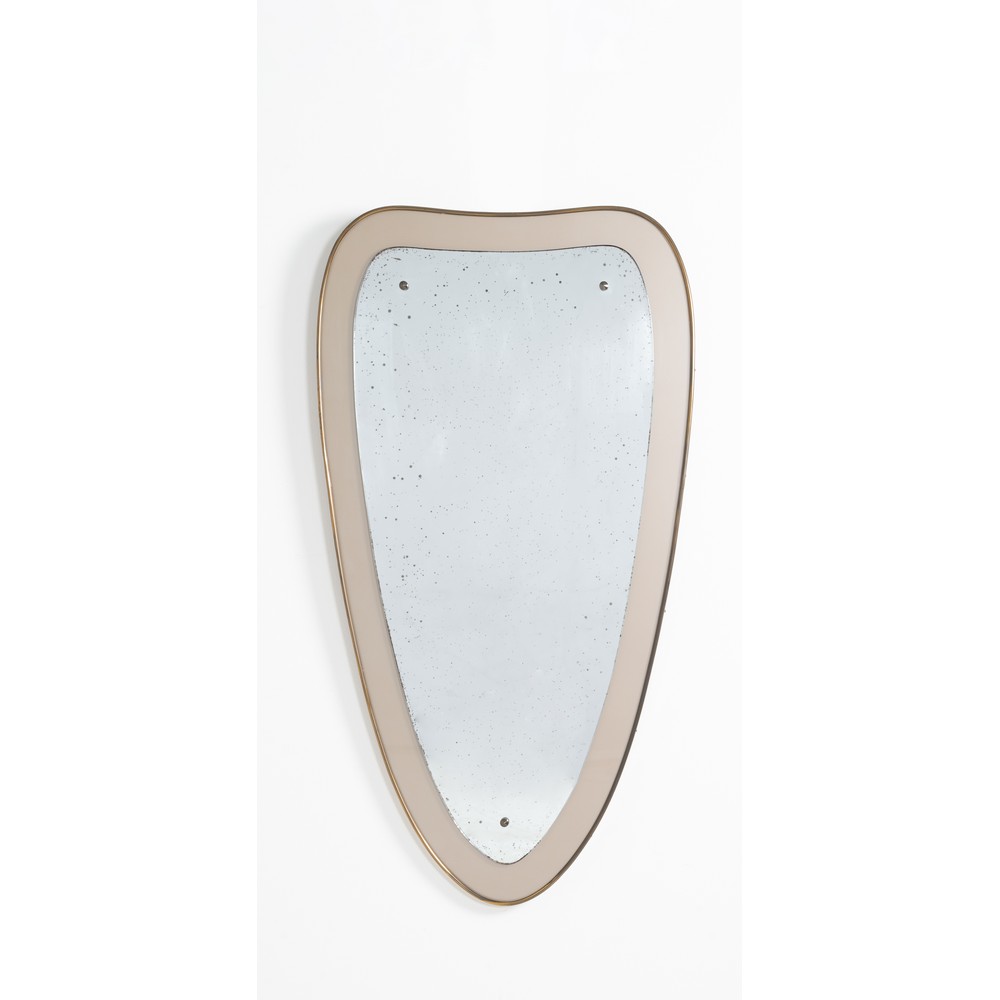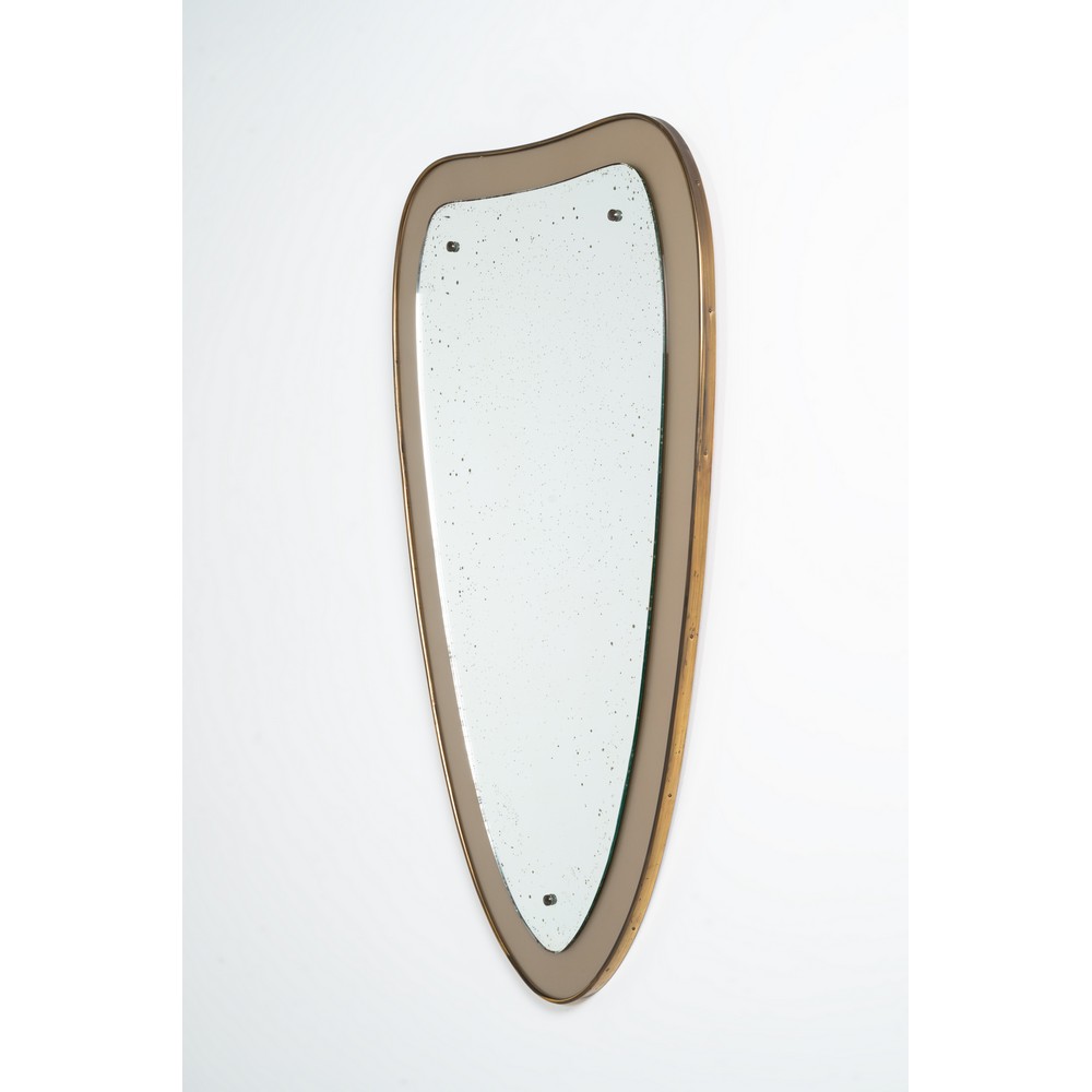 Specchio da parete sagomato con cornice in metallo dorato, metallo verniciato tortora e cristallo specchiato, minuterie in metallo cromato. Lievi ossidazioni.