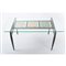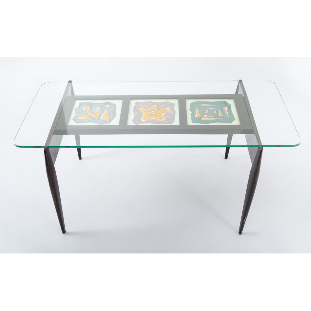 Tavolo basso con struttura in legno e decorato con tre formelle in ceramica decorata in policromia con motivi astratti geometrici, piano rettangolare in vetro trasparente.
