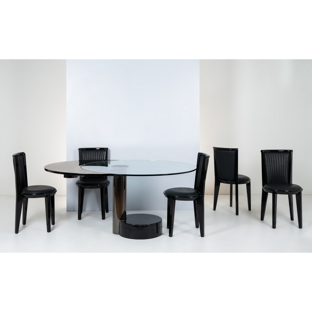 Tavolo da pranzo trasformabile modello “Moon”, struttura in metallo cromato, piano circolare in cristallo trasparente, legno laccato nero, base in marmo. Cinque sedie in legno laccato lucido nero, schienale e seduta in pelle nera.
