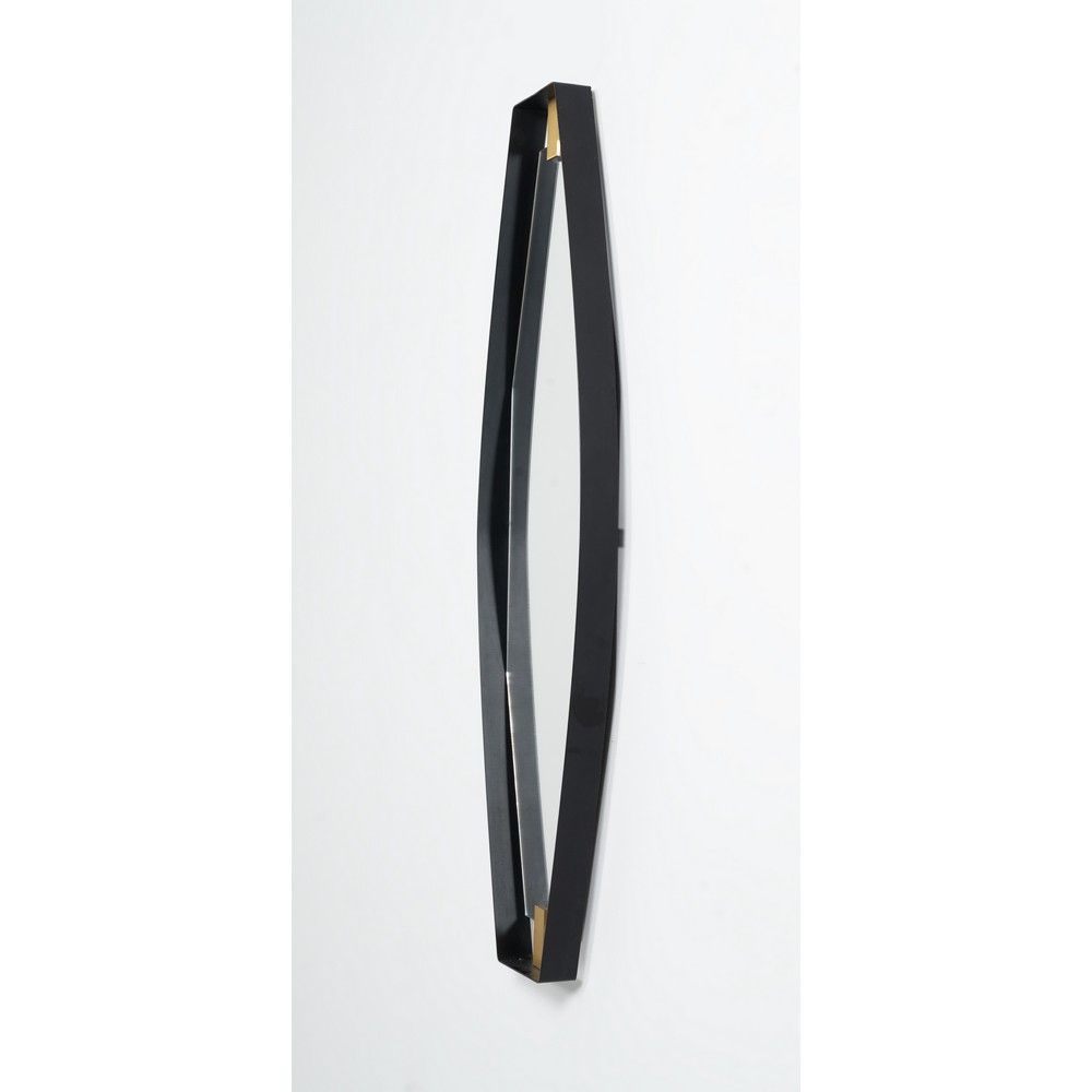Specchio da parete con cornice ovalizzata in metallo verniciato nero ed ottone, cristallo specchiato.