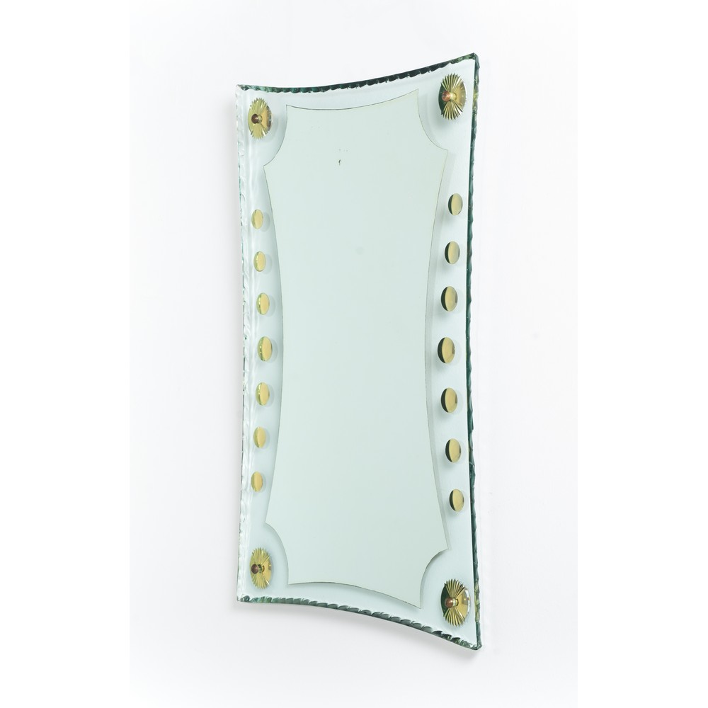 Specchio da parete rettangolare, cristallo trasparente con decori incisi e dorati, cristallo specchiato sagomato.