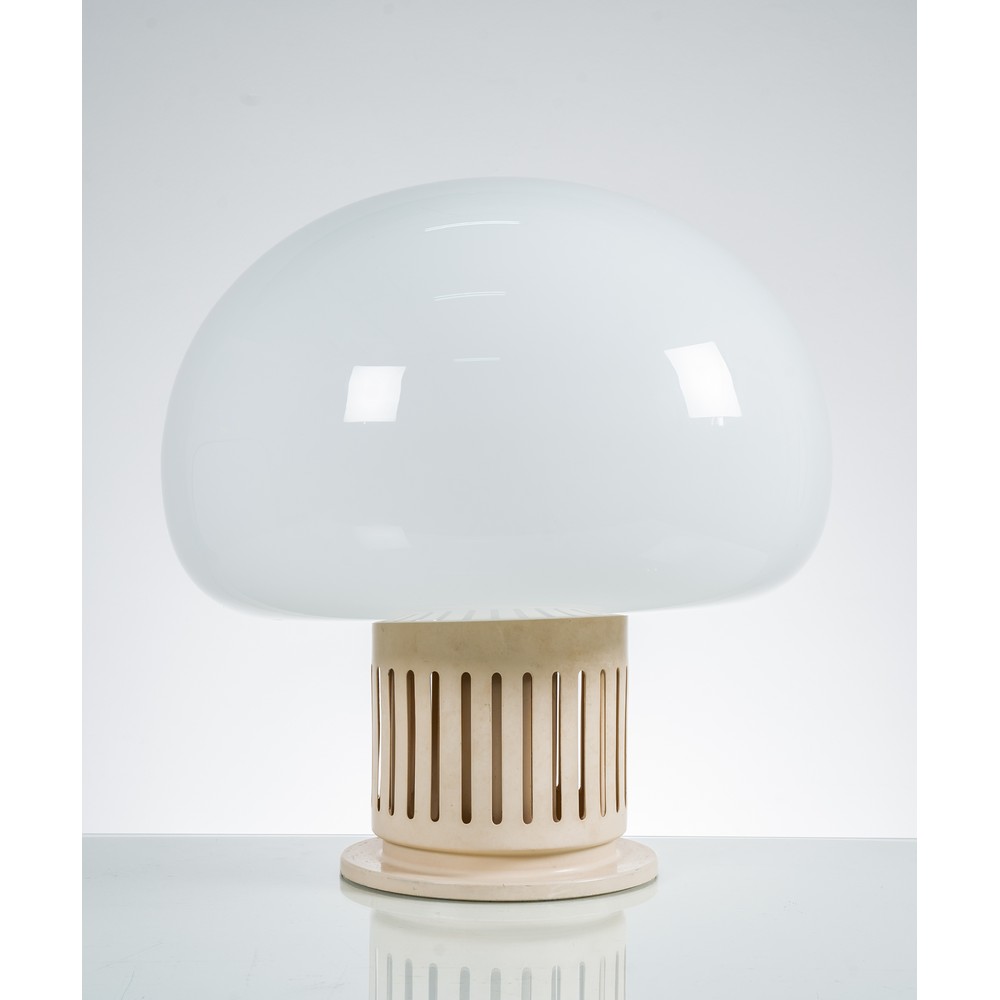 Lampada da tavolo ad una luce modello “Paola”, struttura cilindrica in metallo verniciato bianco, diffusore semisferico in vetro opalino lattimo.