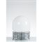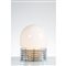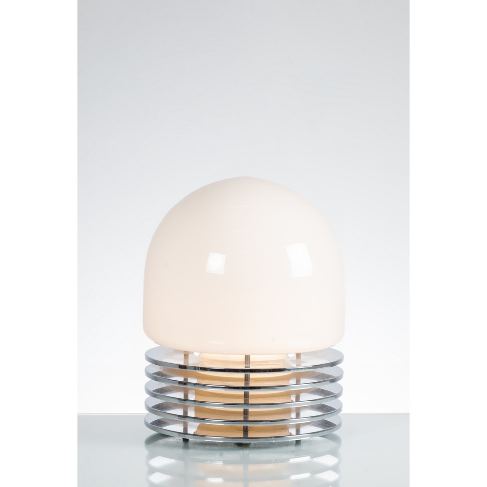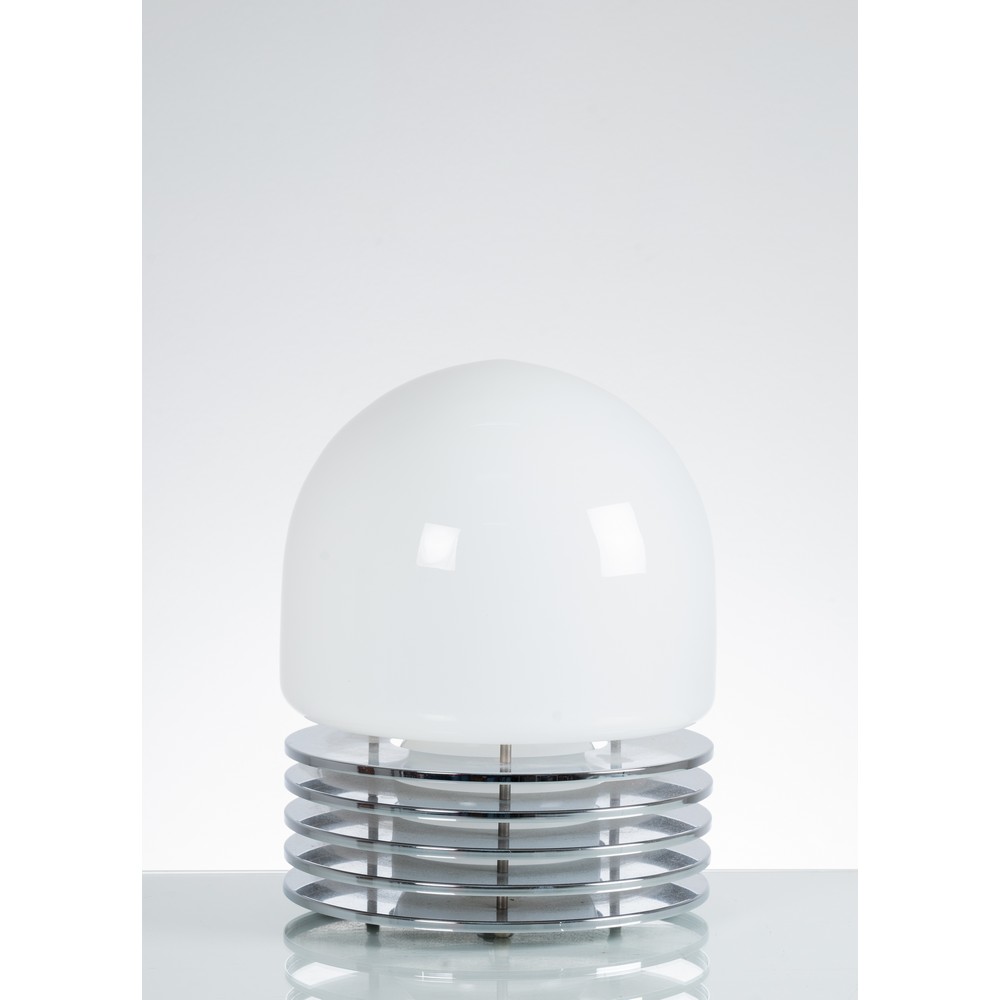 Lampada da tavolo ad una luce con struttura a dischi sovrapposti di acciaio cromato, diffusore semisferico in vetro opalino lattimo.
