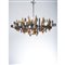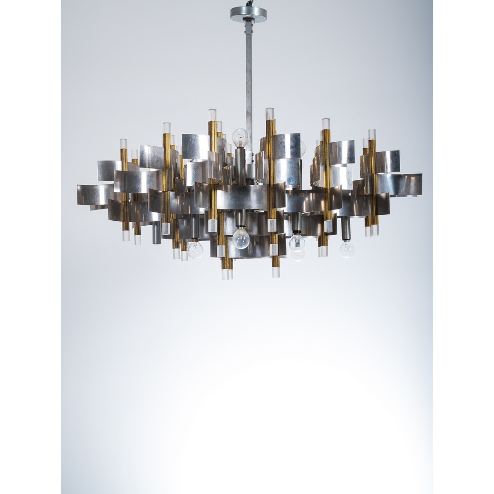 Lampada a sospensione a diciotto luci, struttura composta da fasce curvate in ottone cromato, ottone lucido, inserti in lucite.