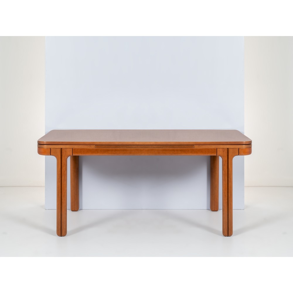 Tavolo da pranzo allungabile in legno di noce, piano rettangolare con angoli arrotondati.