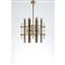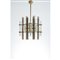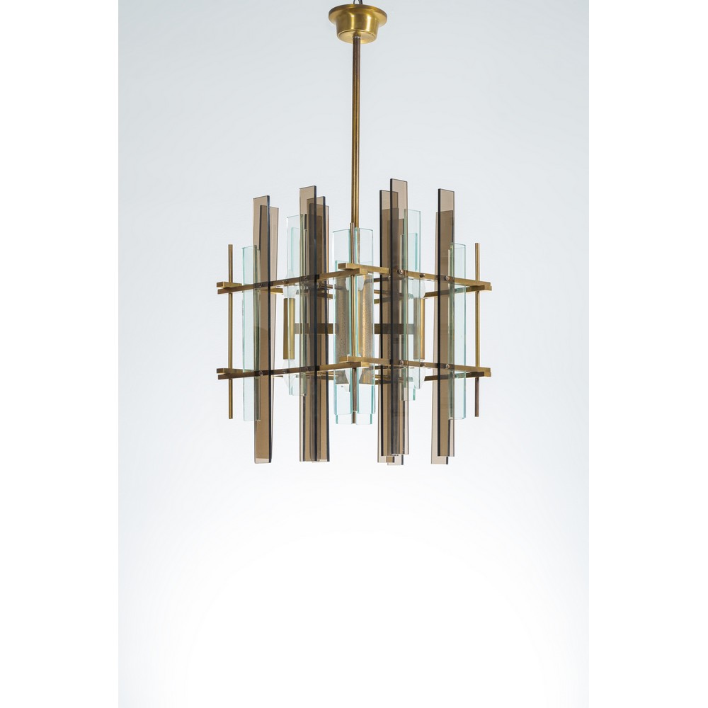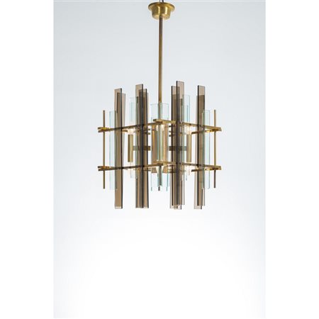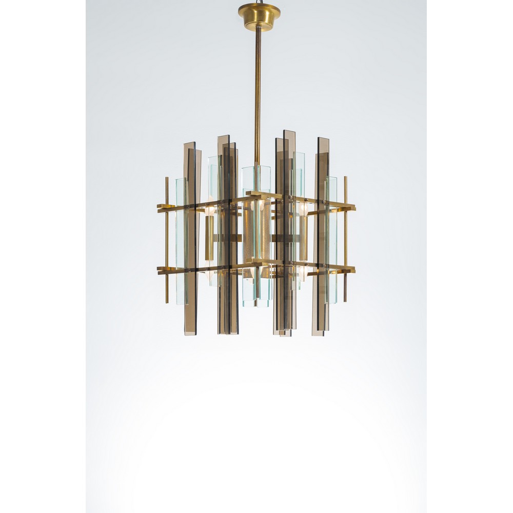 Lampada a sospensione a otto luci, struttura in ottone, diffusore composto da lame rettangolari di vetro incolore e fumè, minuterie in ottone.
