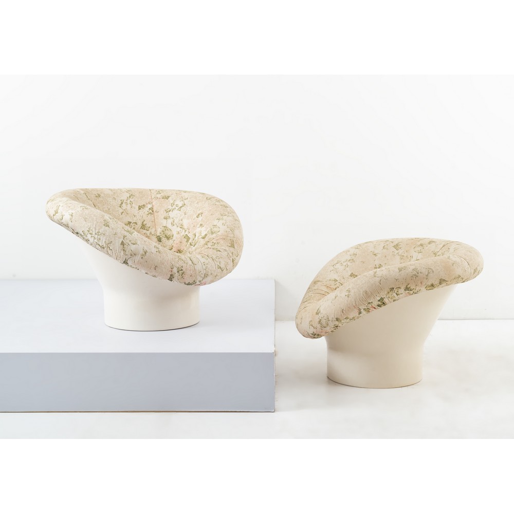 Coppia di poltrone modello “Korkus”, scocca in resina bianca, imbottitura con rivestimento in tessuto chiaro a fiori policromi. Segni di uso.