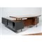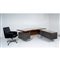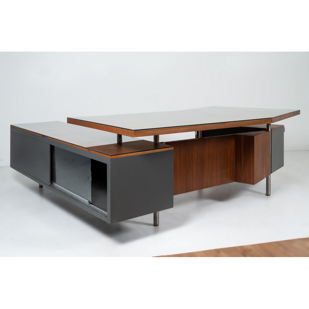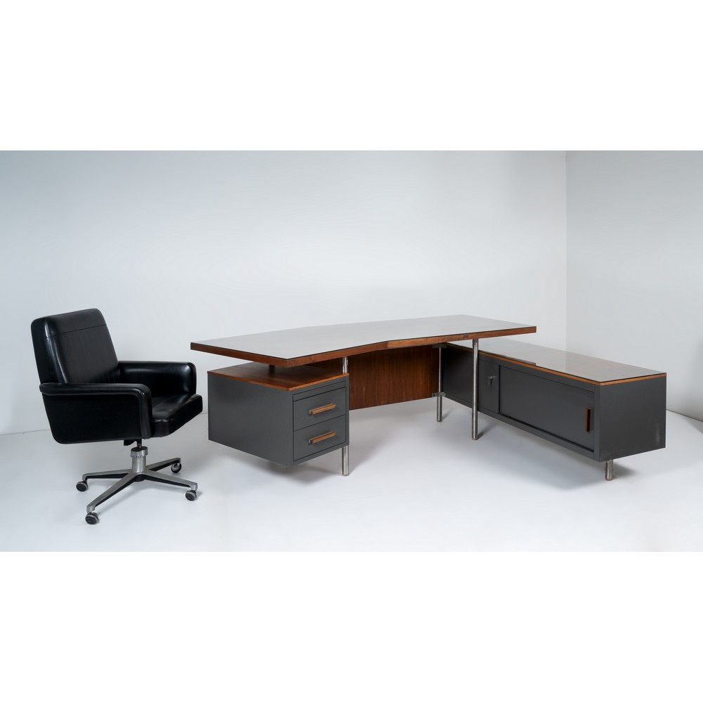 Scrivania direzionale con struttura in tubolare di acciaio cromato, piano a boomerang in legno esotico, una cassettiera con due cassetti in metallo verniciato e un vano chiuso con ante scorrevole, una poltrona girevole con piede in acciaio e seduta con imbottitura e rivestimento in pelle nera. Segni di uso.